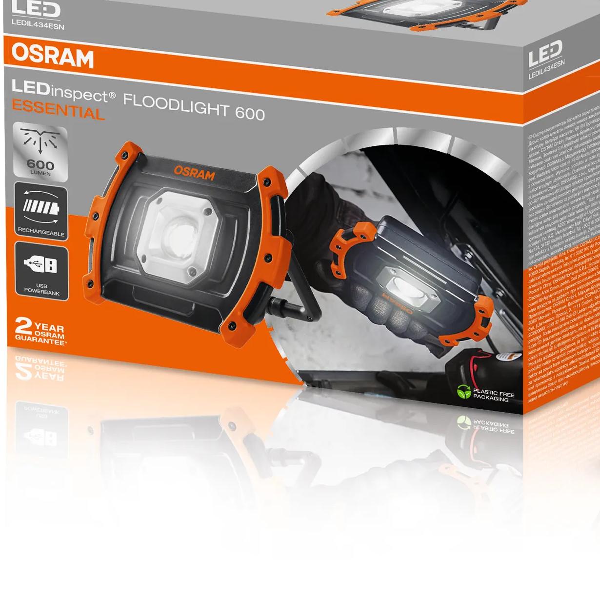The OSRAM LEDinspect FLOODLIGHT 600 ESSENTIAL is a compact, rechargeable work light designed with professionals in mind. Delivering up to 600 lumens of bright, even illumination, it provides valuable extra light for workshops, garages, or on-site tasks.